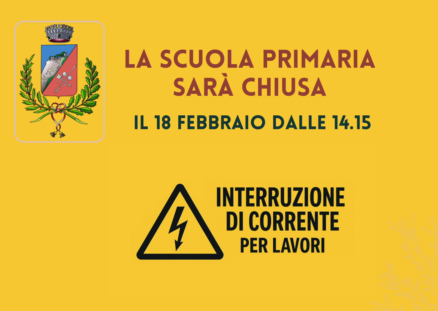 Si comunica che, a seguito dell'ordinanza contingibile e urgente n. 8/26, la Scuola Primaria, a causa dell'interruzione del servizio di energia elettrica, sarà chiusa nel pomeriggio del 18 febbraio (dalle 14.15). Il servizio mensa si svolgerà regolarmente