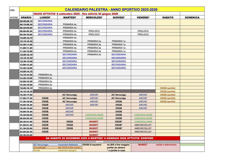 Di seguito l’orario di utilizzo della Palestra per l’anno sportivo 2025/26.